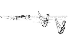 Una corsia o una "corda" di gomma è posta leggermente tesa sulla superficie dell'acqua a 3O cm dal bordo. Per evitare di rovesciarsi, il tuffatore cerca di toccare, durante l'entrata in acqua la corda o la corsia con il collo dei piedi.